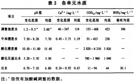 該系統(tǒng)調(diào)試運行10個月來,電化學(xué)部分運行正常,中和槽廢水清澈透明、水質(zhì)穩(wěn)定;接觸氧化池里曝氣系統(tǒng)良好,生物掛膜量不大,產(chǎn)生的污泥較少,出水穩(wěn)定。該工程于2003年5月竣工,8月順利通過【水處理設(shè)備】驗收,各處理單元的出水水質(zhì)見表2。