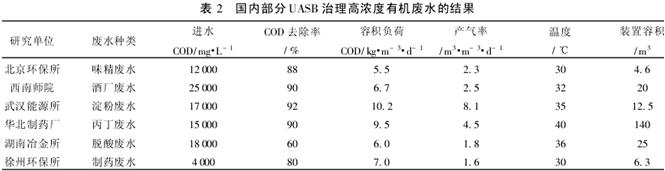 UASB是荷蘭農(nóng)業(yè)大學(xué)幾名教授在AF基礎(chǔ)上發(fā)展起來的,其特點是反應(yīng)器的上部設(shè)置1個氣、固、液三相分離器,混合液中的污泥能自動回到反應(yīng)區(qū)以維持較多的生物量和較長的SRT,整個反應(yīng)器由反應(yīng)區(qū)和沉淀區(qū)兩部分組成。從表2可以看出,UASB具有很高的容積負(fù)荷率和污泥負(fù)荷率。