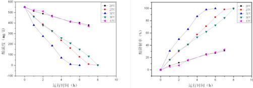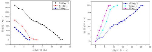 圖為相同的MLSS=3500mg•L-1,pH=7.2,T=25ºC,不同初始濃度下苯酚濃度與時間的關系圖,從圖中看出,酚初始濃度為550 mg•L-1時,經(jīng)過8h時,酚初始濃度為855 mg•L-1時,經(jīng)過12h,酚初始濃度為1500 mg•L-1時,苯酚經(jīng)過26h,苯酚降解完全,降解率達到99%以上。