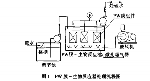 PW—W膜生物反應(yīng)器將膜組件安裝在生物反應(yīng)器中,底部安裝有微孔曝氣器,通過曝氣裝置出來的氣液混合流作為折向過濾流程來實現(xiàn)過濾和清洗膜表面,其處理流程可用圖1表示。