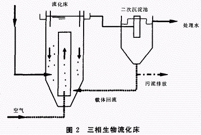 三相生物流化床是氣、液、固三相直接在流化床體內接觸進行生化反應,不另設充氧設備和脫膜設備,載體表面的生物膜依靠氣體的攪動作用,使顆粒之間激烈摩擦而脫落。其工藝流程如圖2所示[2]。三相生物流化床的充氧方式有減壓釋放空氣充氧和射流曝氣充氧等形式。三相生物流化床設備簡單,操作較容易,此外,能耗也較兩相生物流化床低。