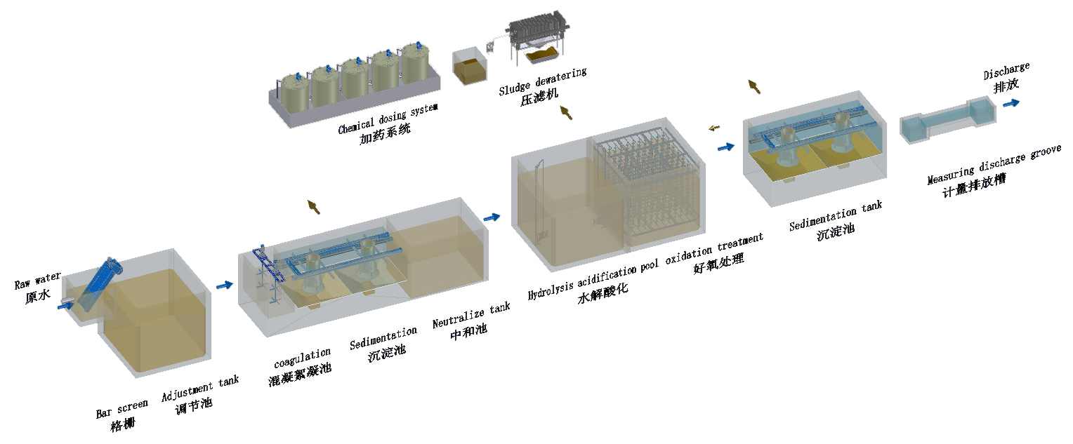 采用化學(xué)沉淀+電解工藝,該工藝技術(shù)先進(jìn)、運(yùn)行成本低、占地面積小,能有效的去除污水中的重金屬。